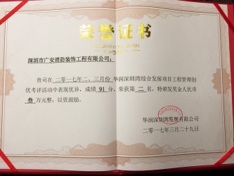 2017年3月29日,深圳市广安消防装饰工程有限公司在二零一七年二、三月份华润深圳湾综合发展项目工程管理创优考评活动中,表现优异,以91分的好成绩,荣获第二名。