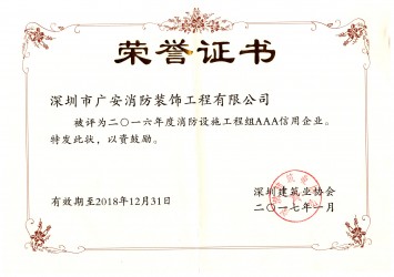 2017年1月,中国建筑业协会颁发九游会j9的荣誉证书:广安消防装饰工程有限公司被评二〇一六年度消防设施工程组aaa信用企业;广安杨逵先生被评二〇一六年度优秀项目经理。